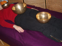 Die Klangschalen werden auf dem bekleideten Körper des liegenden Klienten aufgesetzt bzw. neben dem Körper (in der Aura) aufgestellt und sanft angeschlagen.